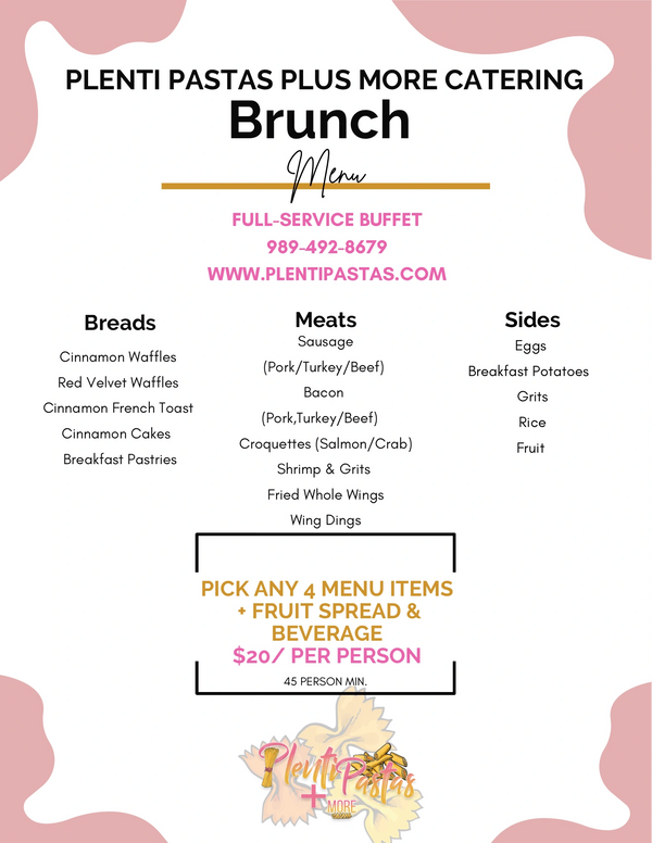 45 person minimum: Brunch Special $20 Per Person. Pick ANY 4 Brunch Items w/ Fruit Spread. *Premium Meats are an additional price. Each additional Brunch Item after 4 will be priced by pan. *-$2per person if you don’t want to include fruit with special*