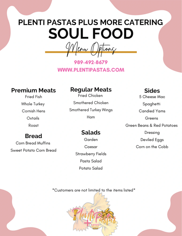 45 Person Minimum, Includes: Luxury Buffet Setup & Cleanup, Salad, & Dinner Rolls, Napkins, Plates, Cups, & Cutlery, Lemonade, Punch, or Tea. * -$2.95 per person from any package without Pasta* PLEASE BE ADVISED THAT THE PRICING BELOW DOES NOT REFLECT NORTHERN CALIFORNIA'S FOOD COSTS, ONLY DETROIT